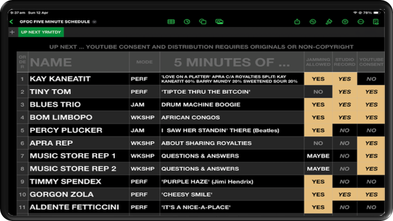 This TV display shows whether jamming, studio recording or YouTube video is part of the action